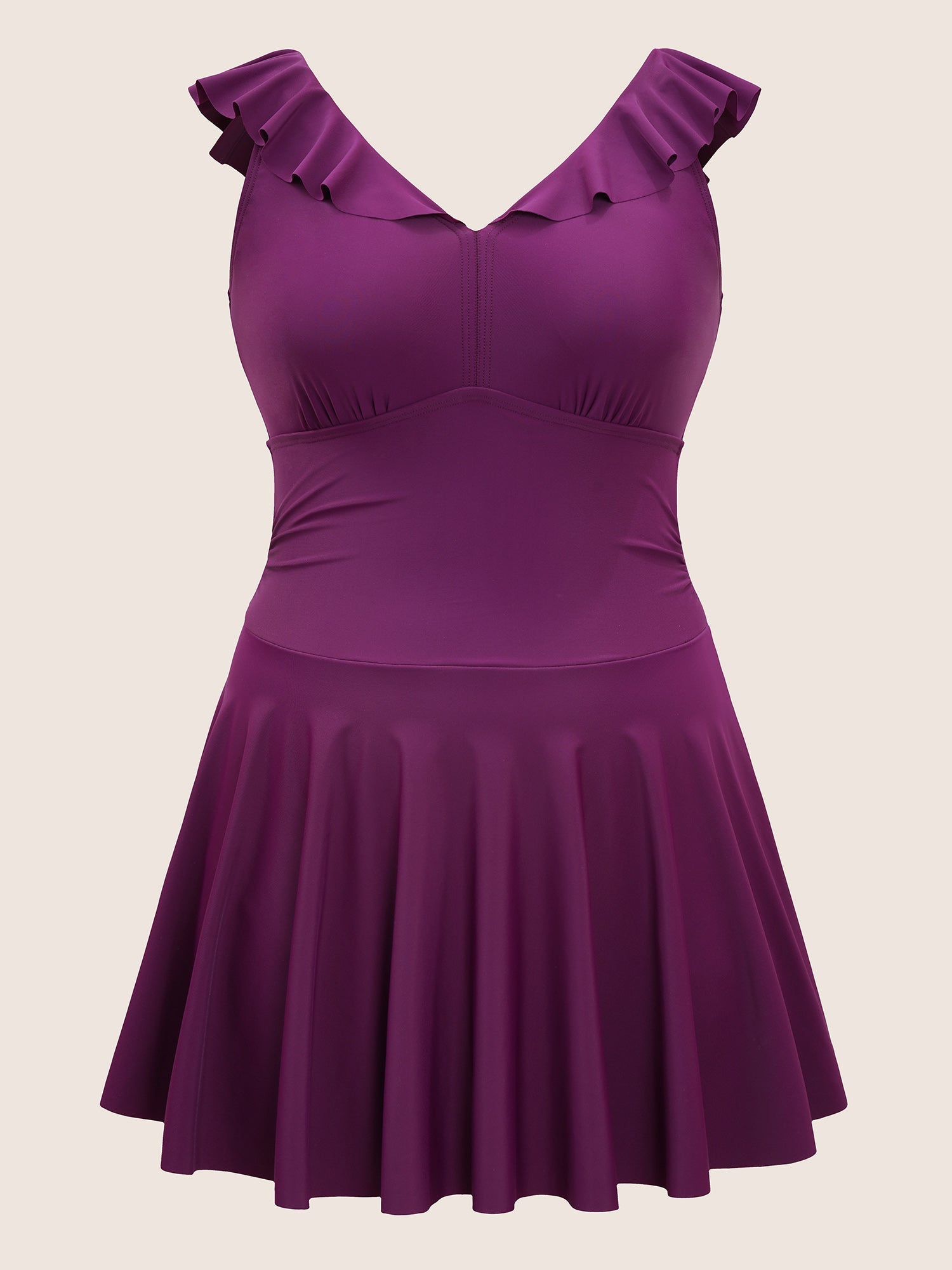 Plain Ruffles Gathered Adjustable Straps Swim Dress