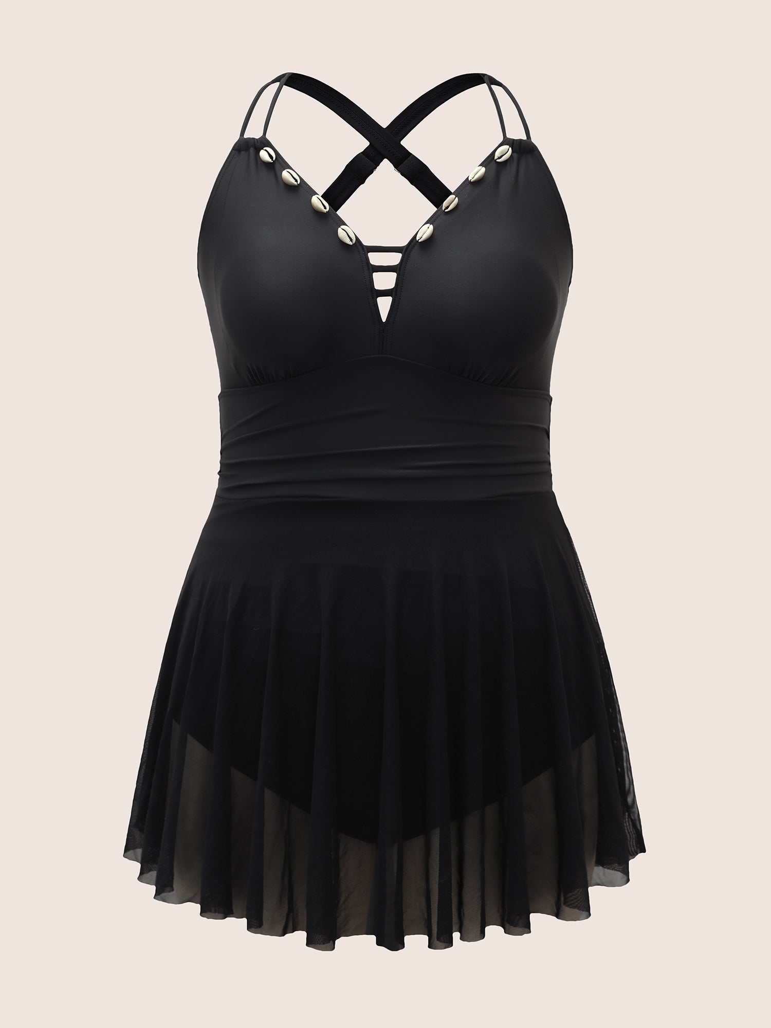 Plain Shell Detail Cut Out Gathered Swim Dress
