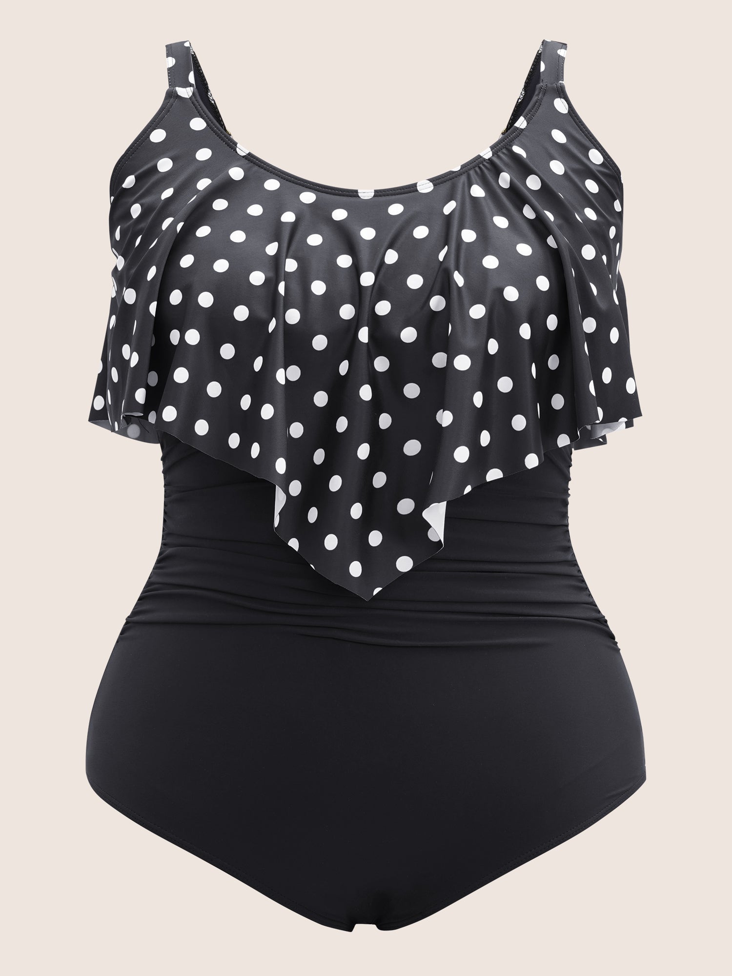 Polka Dot Patchwork Ruffles Gathered One Piece Swimsuit