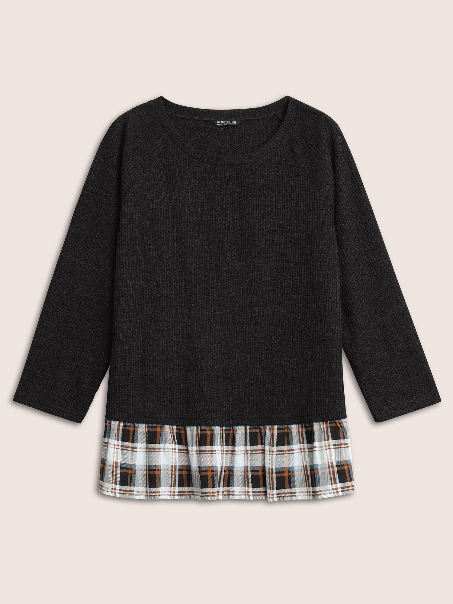 Rib Knit Plaid Patchwork Raglan Sleeve T-shirt