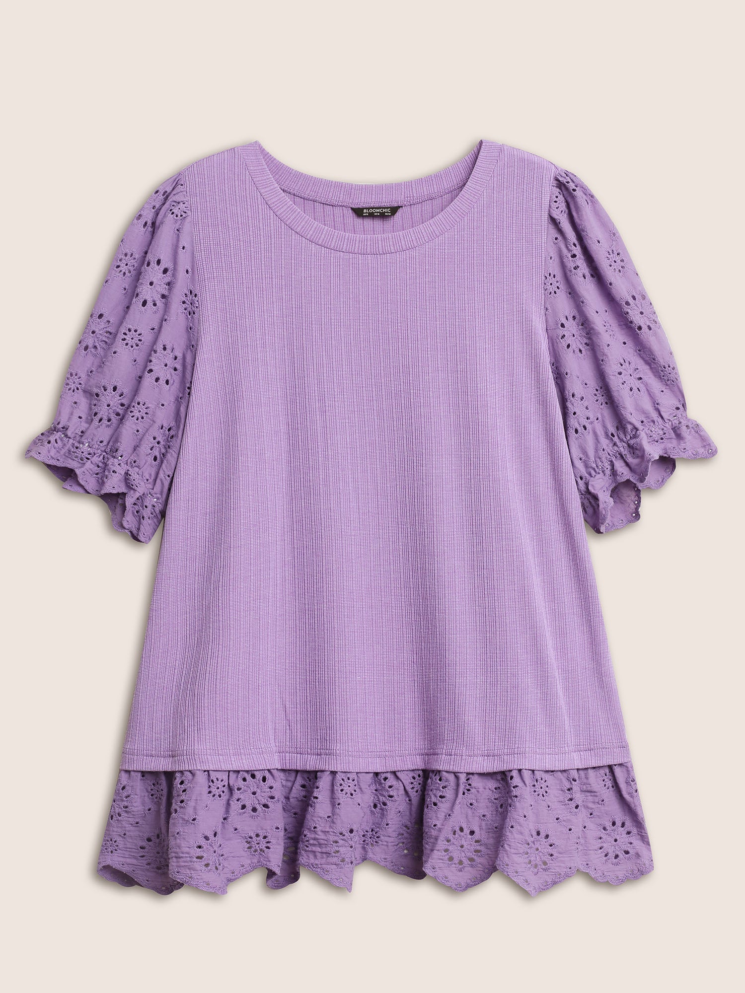 Solid Broderie Anglaise Patchwork Puff Sleeve T-shirt