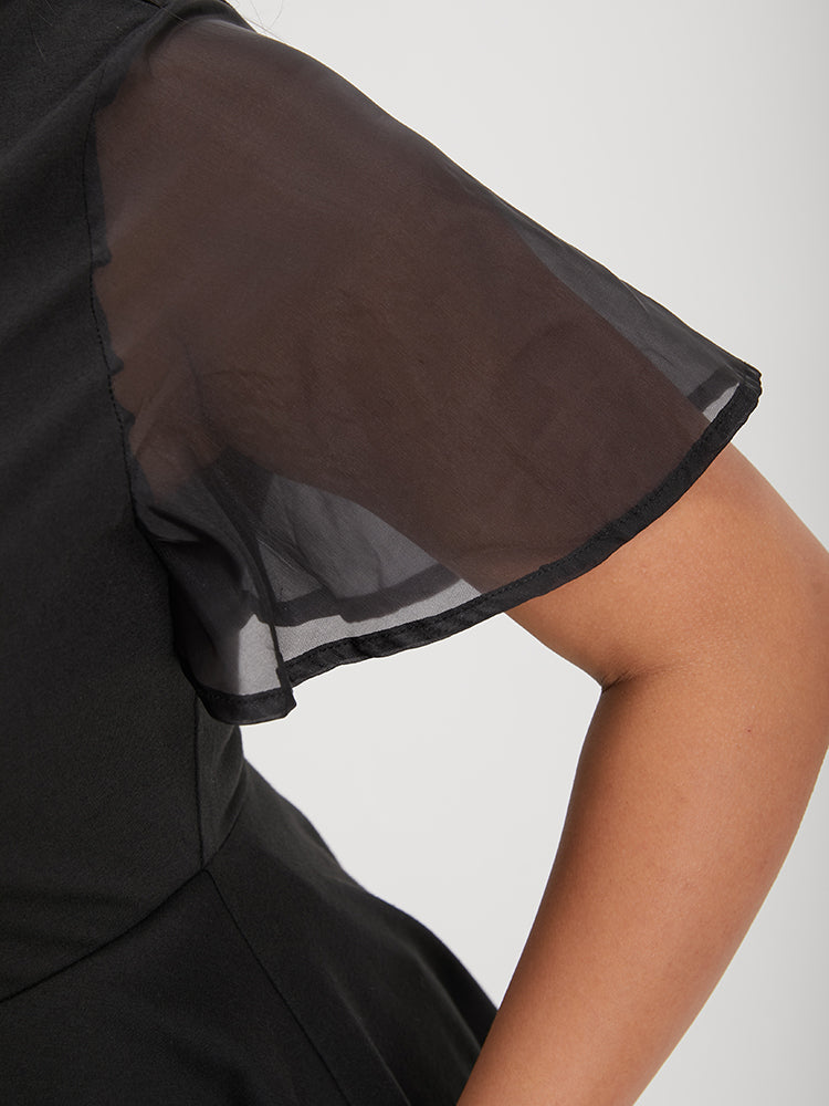 Solid Mesh Patchwork Ruffle Crisscross V Neck T-shirt