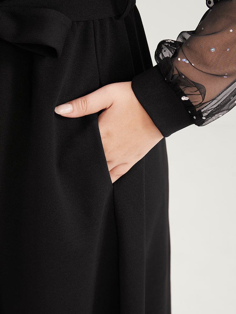Solid Sequin Mesh Lantern Sleeve Surplice Neck Belted Dress