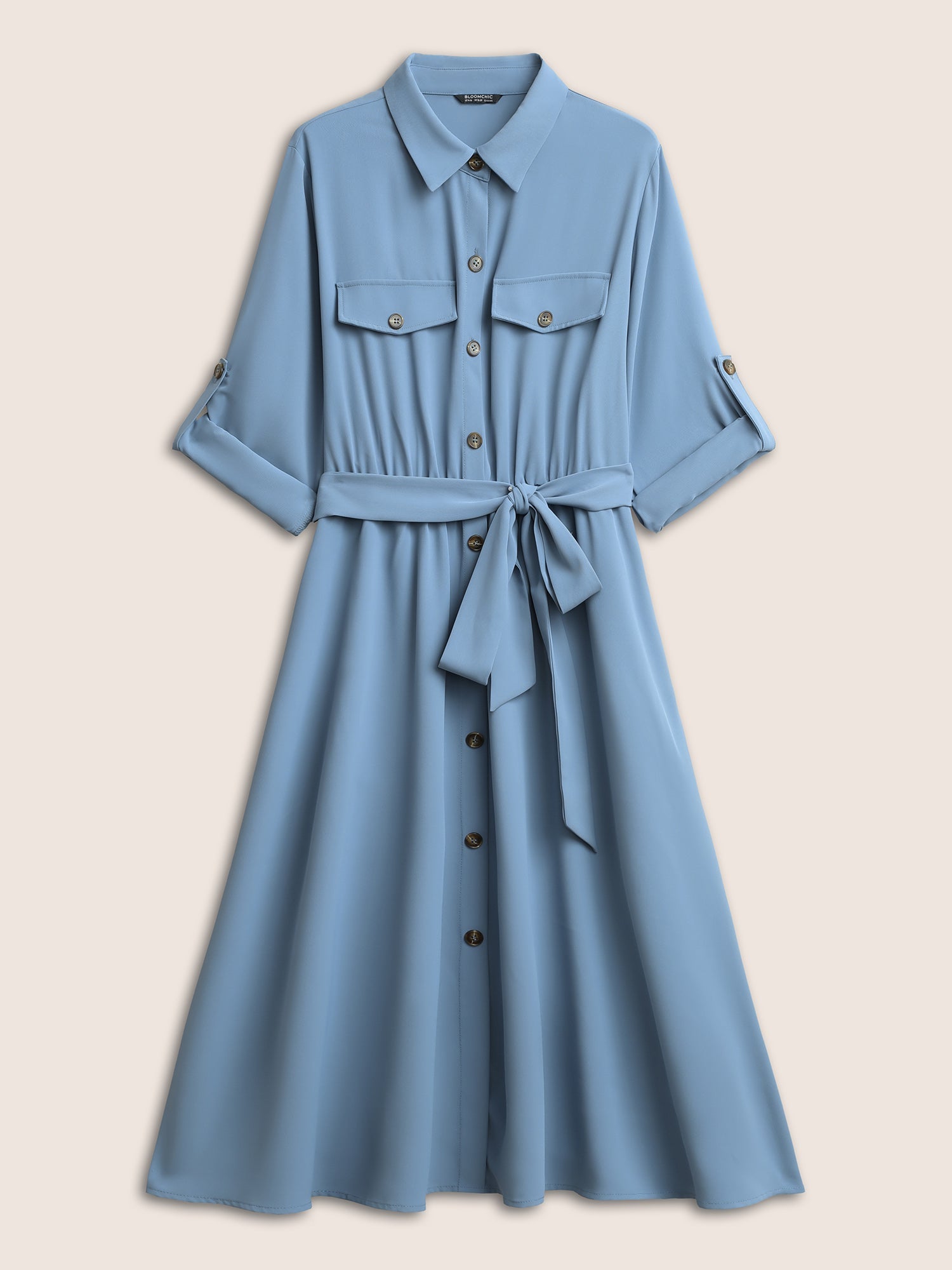 Static-Free Solid Flap Detail Tab Sleeve Dress