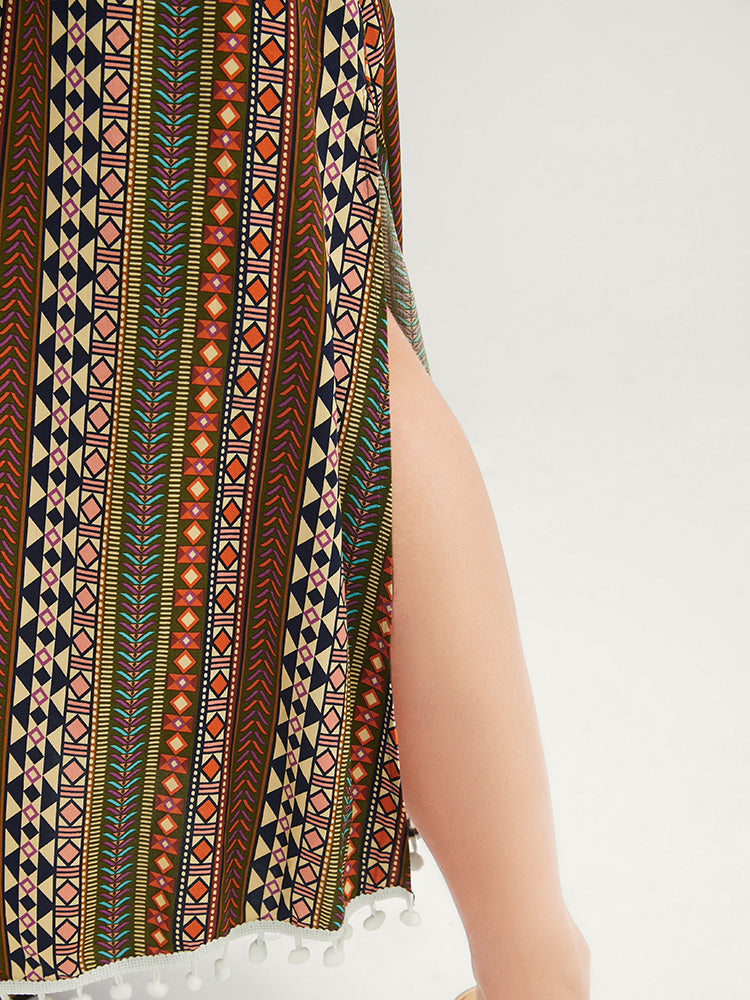 Striped Contrast Cold Shoulder Pocket Pompom Trim Split Ruffles Dress