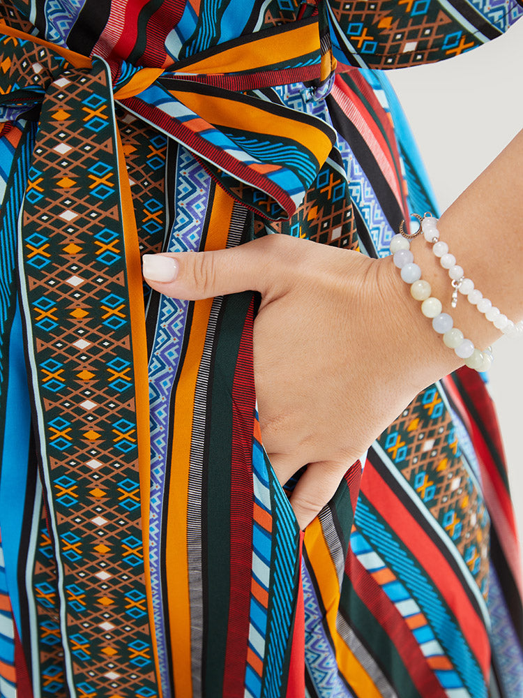Striped Contrast Ruffle Sleeve Wrap Pocket Belt Split Dress