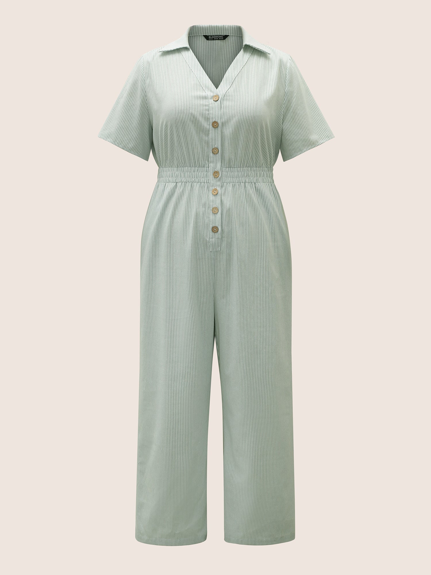 Striped Lapel Collar Shirred Button Detail Jumpsuit